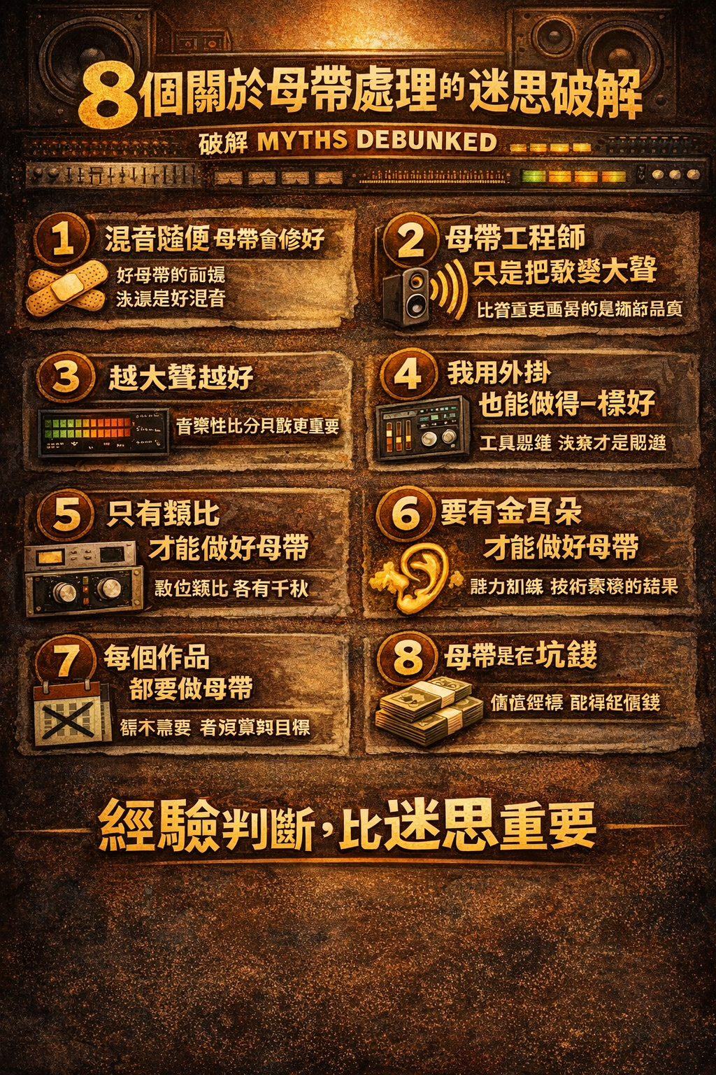 2026-04-01 2026-02-18 Q blog, production, sound 8 個關於母帶處理的迷思破解母帶不是神話,也不是形式。它是一種建立在經驗與判斷之上的專業決策過程。聲音好不好,從來不是靠迷思撐起來的。 Read More 3 0
