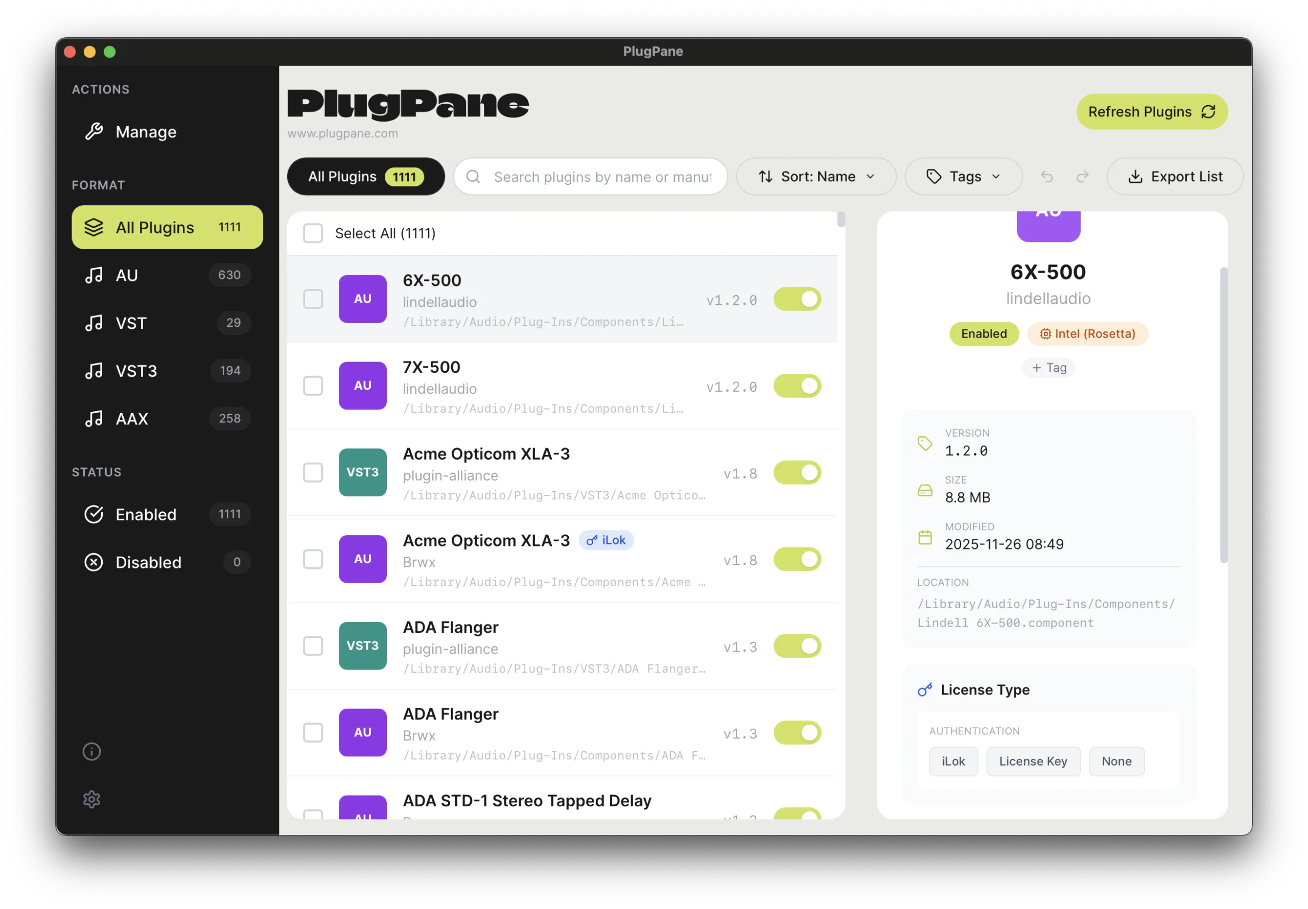 PlugPane是一款插件管理器,能掃描電腦中已安裝的AU/VST/VST3格式插件,顯示所有插件的存儲位置,幫助發現重復安裝,並讓用戶在DAW之外組織管理和標記插件庫。